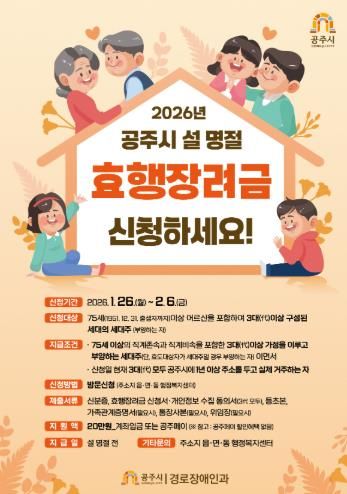 (중부시사신문) 공주시는 지역사회 효 문화 확산과 효행 문화 발전을 위해 설 명절을 맞아 ‘효행장려금’을 지급한다고 22일 밝혔다.