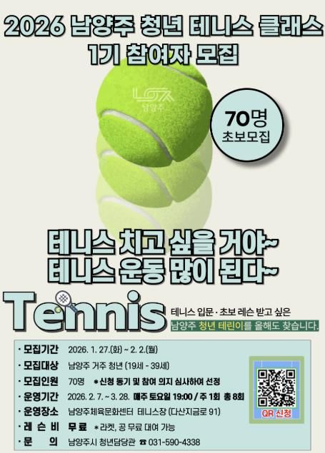 (중부시사신문) 남양주시는 27일부터 내달 2일까지 ‘2026 남양주 청년 테니스 클래스 1기’ 참여자를 모집한다고 밝혔다.
