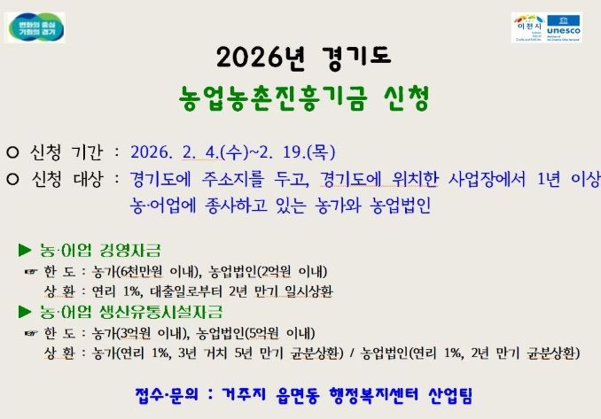 (중부시사신문) 이천시는 농업인에게 장기·저리 융자 지원을 실시하고 경영안정을 돕기 위해 2026년 경기도 농업농촌진흥기금 농어업 경영자금, 농어업 생산유통시설자금 사업에 대한 신청을 2월 3일부터 접수한다.