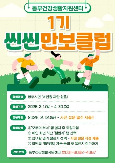 (중부시사신문) 양주시보건소 동부 건강생활지원센터에서는 지역 주민의 건강생활실천율 향상 및 비만율 개선을 위해 2026년도 ‘씬씬 만보클럽’ 1기 참여자를 모집한다.