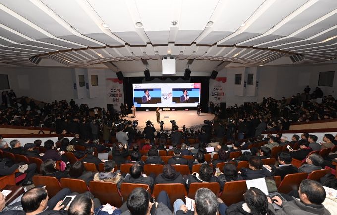 도는 4일 단국대 천안캠퍼스에서 김 지사와 홍성현 도의회 의장, 시장·군수 또는 부단체장, 도와 시군 의회 의원, 사회단체 대표와 전문가, 주민 등 1200여 명이 참석한 가운데 대전·충남 행정통합 타운홀 미팅을 개최했다.