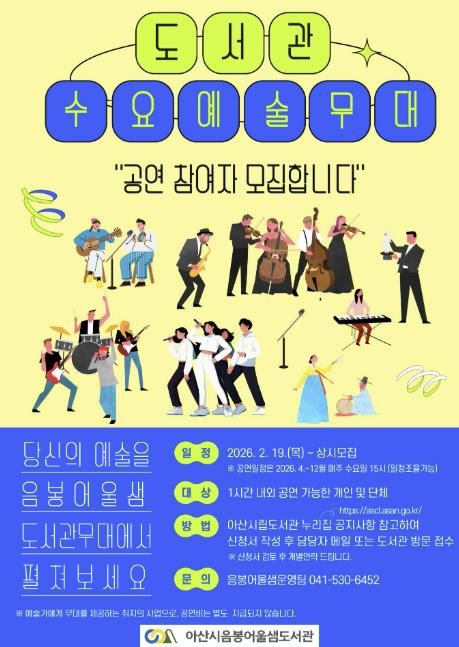 아산시 관계자는 “지난해 26회의 공연을 통해 도서관 수요예술무대가 시민들에게 친숙한 문화 프로그램으로 자리 잡았다”며 “올해도 다양한 예술가들의 참여를 통해 도서관이 지역 문화 거점으로서 역할을 더욱 확대해 나가길 기대한다”고 말했다.