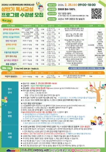 (중부시사신문) 서산문화복지센터 어린이도서관은 오는 19일부터 ‘2026년 어린이도서관 상반기 프로그램’ 10개 강좌, 수강생 116명을 홈페이지를 통해 선착순 모집한다고 밝혔다.