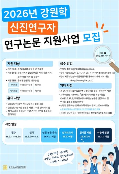 연구계획서 접수기간은 3월 11일부터 3월 20일까지이며, 신청은 강원역사문화연구원 누리집 공지사항에서 신청서를 내려받아 이메일로 접수하면 된다.