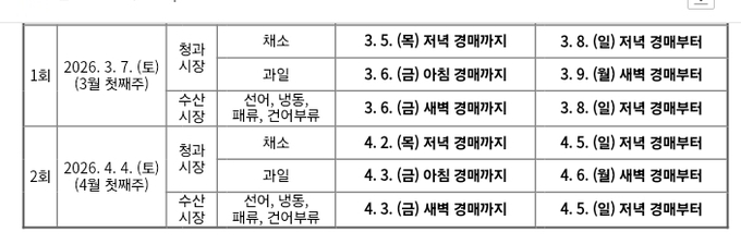 오는 3월과 4월에 운영되는 임시 휴업일에 경매는 실시하지 않지만 정가·수의매매, 제3자 판매가 가능하며 정부 농수산물 온라인 도매시장 거래 물품 반입도 정상적으로 이루어진다.