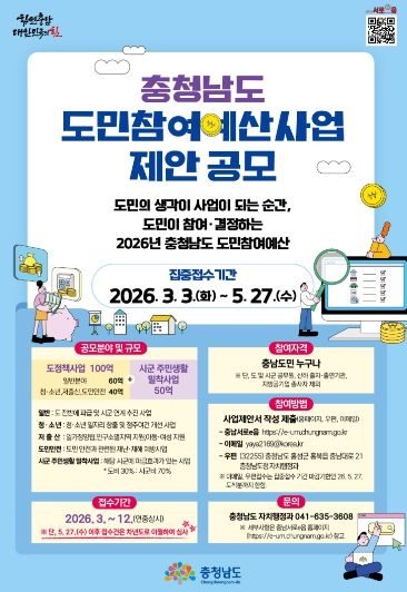 (중부시사신문) 충남도는 3월 3일부터 5월 27일까지 2027년 예산안에 반영할 ‘도민참여예산 제안사업’ 집중 접수기간을 운영한다고 26일 밝혔다.