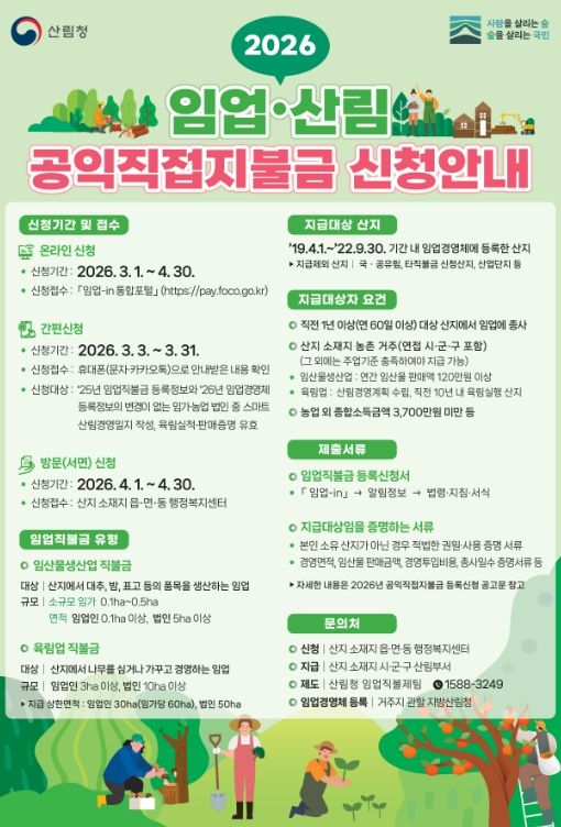 (중부시사신문) 청양군이 임업인의 소득을 보전하고 산림의 공익적 가치를 높이기 위해 ‘2026년 임업·산림 공익직접지불금’ 신청 접수를 내달 4일부터 시작한다.