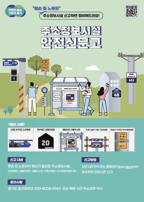 아울러 스마트 주소정보시설에 부착된 QR코드를 통해 산불방지, 찾아가는 정약용 도시대학 등 다양한 시책 및 홍보자료를 제공해 디지털 기반의 생활 밀착형 정보 서비스도 지속 확대한다. 주소정보시설이 훼손되거나 노후해 정비가 필요할 경우 ‘국민신문고’ 및 ‘경기도 주소정보시설 안전신문고’를 통해 신고할 수 있다.