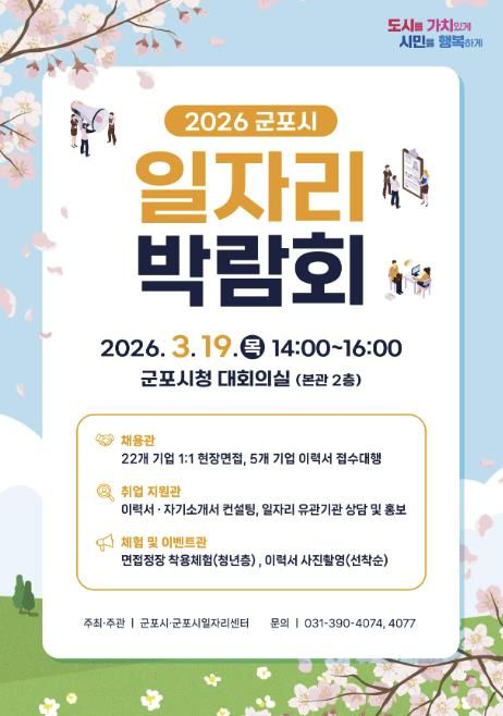 (중부시사신문) 군포시는 오는 3월 19일 오후 2시부터 시청 대회의실에서 ‘2026년 군포시 일자리 박람회’를 개최한다. 이번 박람회는 지역 내 우수 기업과 구직자가 직접 만나는 채용의 장으로 제조, 서비스, 물류배송, 의료복지 등 다양한 분야에서 폭넓은 취업 기회를 제공할 예정이다.