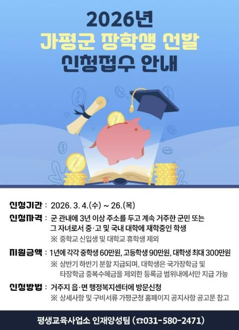 (중부시사신문) 가평군이 지역 학생들의 균등한 교육 기회를 보장하고 우수 인재를 육성하기 위해 2026년도 장학생 선발에 나선다.