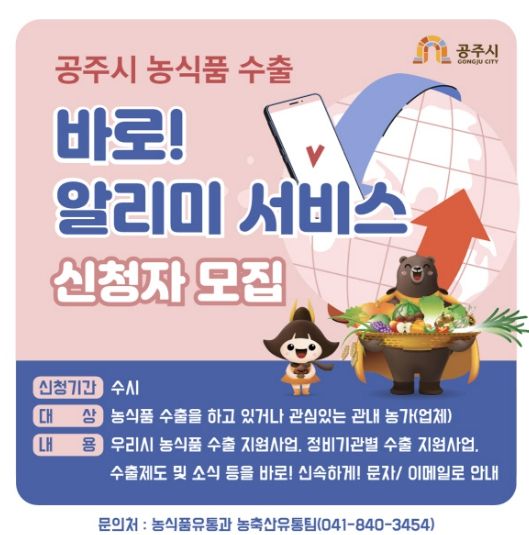 ‘농식품 수출 바로 알리미’ 서비스는 공주시와 정부 기관에서 제공하는 각종 수출 지원사업과 수출 교육 등 다양한 수출 관련 정보를 문자와 전자우편(이메일)을 통해 수시로 제공하는 서비스다.