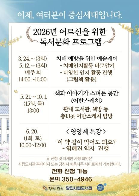 (중부시사신문) 당진시는 어르신들이 책을 매개로 다양한 문화 활동을 경험하며 건강과 삶의 질을 높이기 위해 시립송악도서관에서 어르신 대상 독서문화 프로그램을 운영한다고 10일 밝혔다.