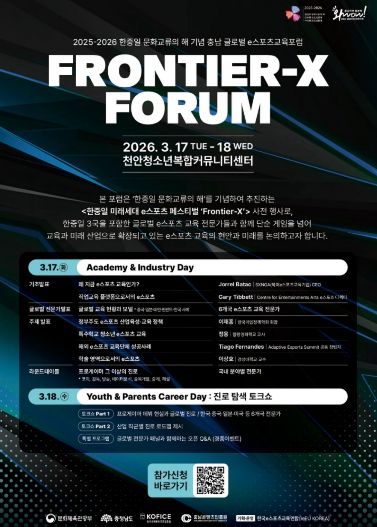 (중부시사신문) 충남콘텐츠진흥원은 오는 3월 17일 ~ 18일 천안청소년복합커뮤니티센터에서 충남 글로벌 이스포츠 교육 포럼을 개최한다고 밝혔다.
