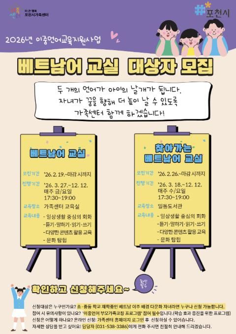 (중부시사신문) 포천시 직영 ‘더 큰 행복 포천시가족센터’는 다문화 자녀의 이중언어 역량 강화를 위한 2026년 이중언어 교육지원사업 베트남 교실 수강생을 모집한다.