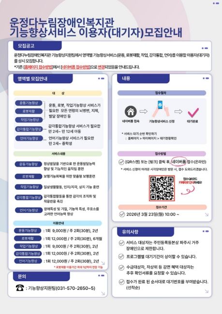 (중부시사신문) 파주시 운정다누림장애인복지관은 지역 내 장애인의 기능 향상과 일상생활 능력 증진을 위해 ‘기능향상서비스’참여자를 오는 23일부터 상시 모집한다.