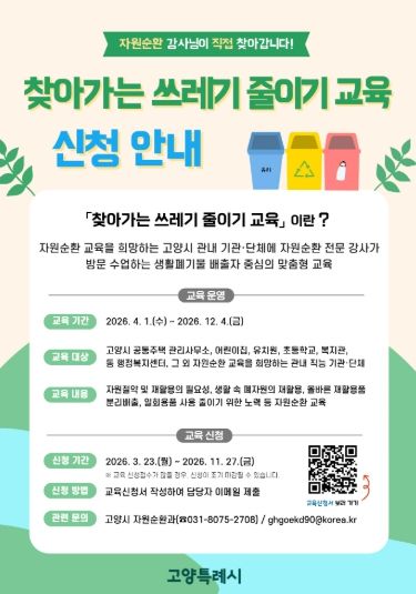 (중부시사신문) 고양특례시는 생활 속 자원순환 실천을 유도하기 위해 오는 4월부터 12월까지 9개월간 ‘2026년 찾아가는 쓰레기 줄이기 교육’을 운영한다.
