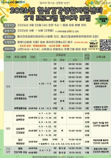 (중부시사신문) 광명시 보건소 철산건강생활지원센터가 ‘2026년 건강생활 프로그램 2기’ 참가자를 오는 25일 오전 9시부터 선착순 모집한다.
