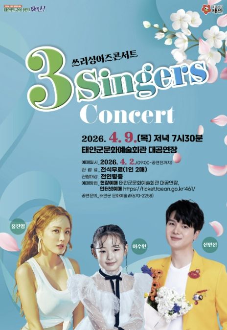 (중부시사신문) 태안군이 4월 9일 태안군문화예술회관 대공연장에서 홍진영 등 유명 가수가 출연하는 ‘3-Singers 콘서트’를 개최한다.
