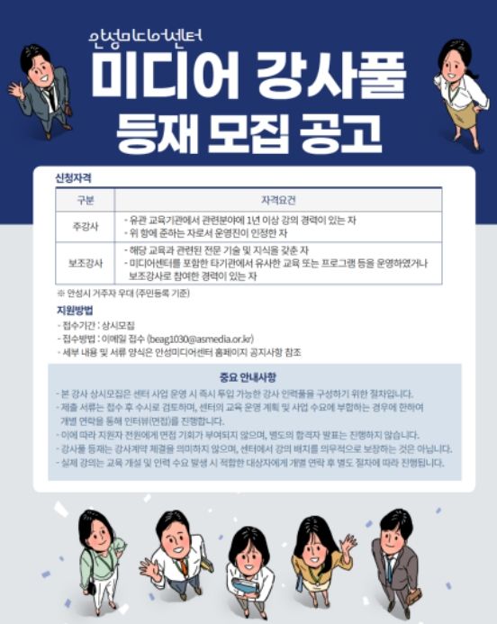 (중부시사신문) 안성시는 4월 1일부터 보다 체계적이고 전문적인 미디어 교육 운영을 위해 ‘미디어 강사풀’ 등재 강사를 상시 모집한다.