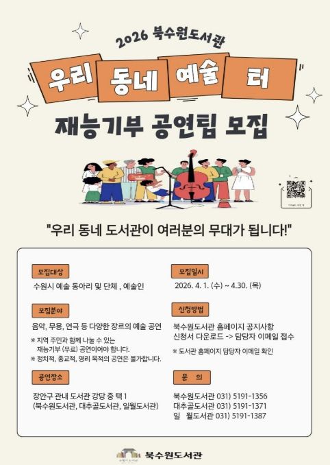 수원시 관계자는 “이번 사업은 이웃의 재능을 나누며 도서관을 소통의 공간으로 만드는 데 의미가 있다”며 “지역 예술인에게는 무대를, 시민에게는 문화 향유 기회를 제공하는 만큼 많은 참여를 바란다”고 말했다.