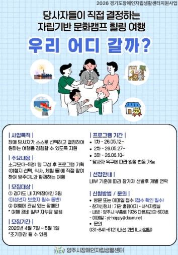 (중부시사신문) 양주시장애인자립생활센터에서는 장애인 당사자가 직접 선택하고 결정하는 자립 기반 힐링 여행을 목적으로 하는 지역 장애인 문화캠프 [우리 어디 갈까?] 참가자를 모집한다.