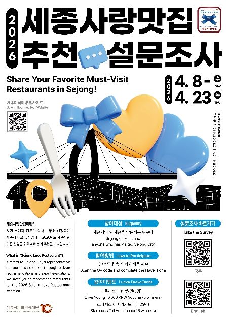 (중부시사신문) 세종시문화관광재단은 지역 대표 맛집 발굴을 위해 4월 8일부터 23일까지 ‘2026 세종사랑맛집’ 선정을 위한 시민 참여형 설문조사를 실시한다고 밝혔다.