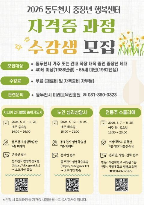 (중부시사신문) 동두천시 미래교육진흥원은 지역 내 중장년층의 성공적인 인생 2막과 안정적인 사회 참여를 지원하기 위해 ‘2026년 중장년 행복센터 자격증 과정’ 수강생을 모집한다고 밝혔다.