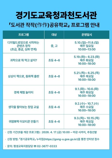 조중복 경기도교육청과천도서관장은 “작작(作作) 공유학교는 독서를 기반으로 학생들이 스스로 생각하고 표현하는 경험을 통해 미래 역량을 키우는 프로그램”이라며 “앞으로도 학교와 지역을 연계한 다양한 교육 프로그램을 통해 학생 중심의 배움 환경을 지속적으로 확대해 나가겠다”고 말했다.