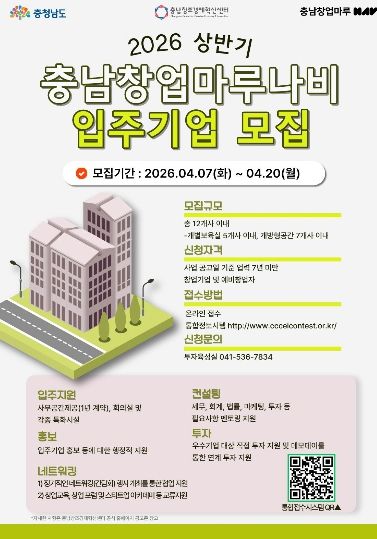 (중부시사신문) (재)충남창조경제혁신센터는 이달 20일까지 2026년 충남창업마루나비 입주기업을 모집한다고 밝혔다.