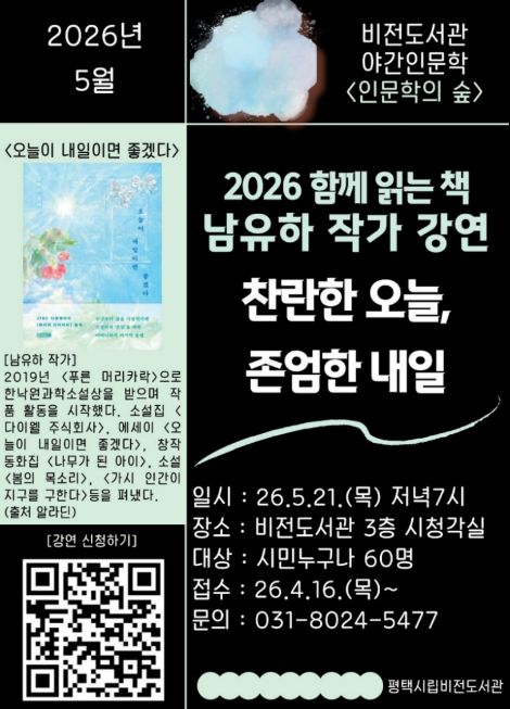 (중부시사신문) 평택시립 비전도서관은 오는 5월 21일 저녁 7시 남유하 작가를 초청하여 ‘찬란한 오늘, 존엄한 내일’을 주제로 야간 인문학 강연을 진행한다.
