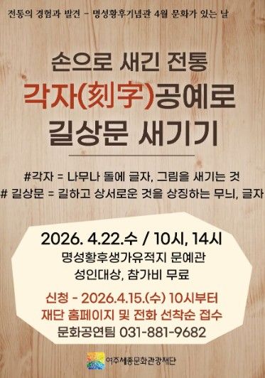(중부시사신문) 여주세종문화관광재단은 오는 4월 22일, 명성황후기념관 4월 문화가 있는 날 프로그램으로 '손으로 새긴 전통, 각자(刻字)공예로 길상문 새기기'를 진행한다.