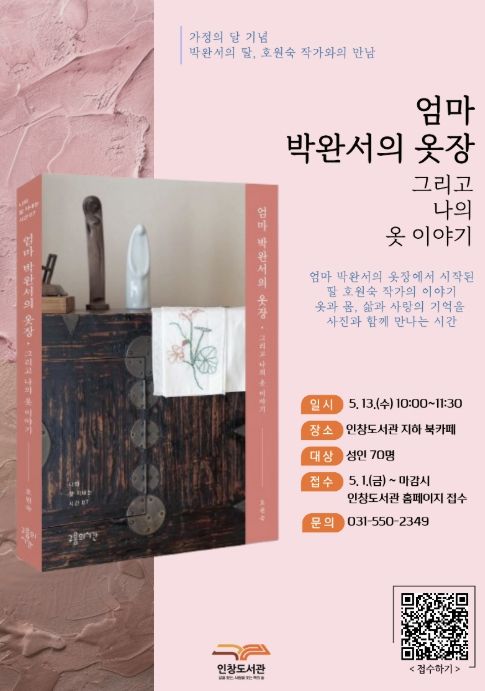 (중부시사신문) 구리시립도서관은 '호원숙 작가와의 만남 ‘엄마 박완서의 옷장, 그리고 나의 이야기’' 참여 신청을 오는 5월 1일부터 접수한다고 밝혔다.