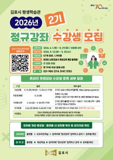 (중부시사신문) 김포시가 시민의 평생학습 참여 기회를 확대하고 변화하는 사회 환경에 대응할 수 있는 역량 강화를 위해 ‘2026년 2기 평생교육 정규강좌’ 수강생을 모집한다고 밝혔다.