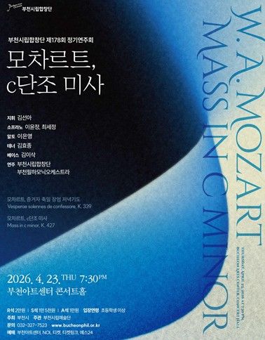 한편, 부천시립합창단 제178회 정기연주회 ‘모차르트, c단조 미사’는 부천아트센터 홈페이지 및 각종 예매처(NOL 티켓, 티켓링크, 예스24티켓)에서 예매할 수 있으며, 티켓 가격은 R석 2만원, S석 1만 5천원, A석 1만원이다.