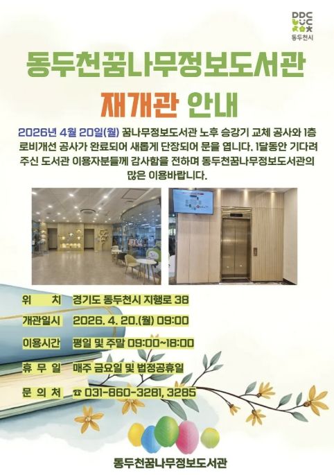 (중부시사신문) 동두천시 도서문화사업소 꿈나무정보도서관은 이용자 편의성과 안전성 강화를 위한 승강기 교체 공사와 1층 로비 환경개선 공사를 마치고 지난 4월 20일부터 재개관했다고 밝혔다.