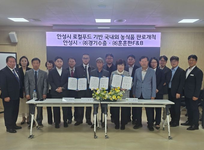 (중부시사신문) 안성시 농업기술센터는 지난 4월 17일, 안성시 농특산물 및 농식품의 국내외 판로 확대를 위해 ㈜경기수출, ㈜훈훈한F&B와 전략적 업무협약(MOU)을 체결했다고 밝혔다.