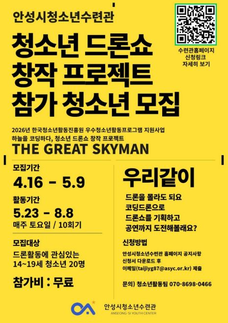 (중부시사신문) 안성시청소년수련관은 미래 디지털 인재 양성을 위한 청소년 참여형 프로그램 '하늘을 코딩하다, 청소년 드론쇼 창작 프로젝트 ‘THE GREAT SKYMAN’'에 참여할 청소년을 4월 16일 ~ 5월 8일까지 모집한다고 밝혔다.