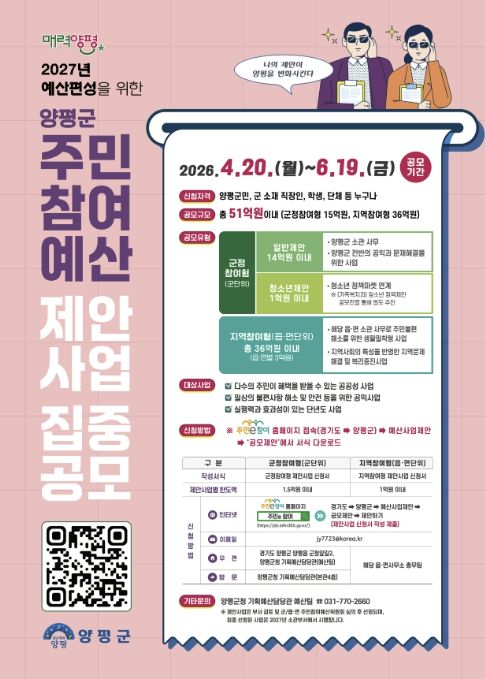 (중부시사신문) 양평군은 오는 6월 19일까지 2027년 예산에 반영할 ‘주민참여예산 제안사업’을 집중 공모한다고 밝혔다.