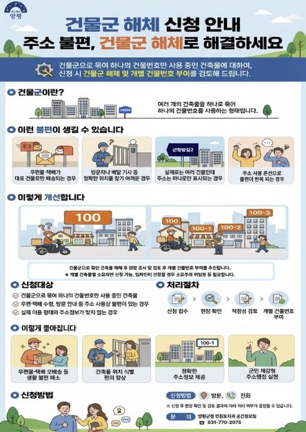 (중부시사신문) 양평군은 건물군으로 묶여 하나의 건물번호만 사용하고 있는 건축물을 대상으로 건물군 해체 및 개별 건물번호 부여를 추진해 군민의 주소 사용 불편을 해소할 계획이라고 밝혔다. 이번 사업은 국민불편사항 개선 과제의 일환으로 추진되며, 실제 이용 형태와 맞지 않는 주소 체계를 정비해 보다 정확한 주소 사용 환경을 조성하기 위해 마련됐다.