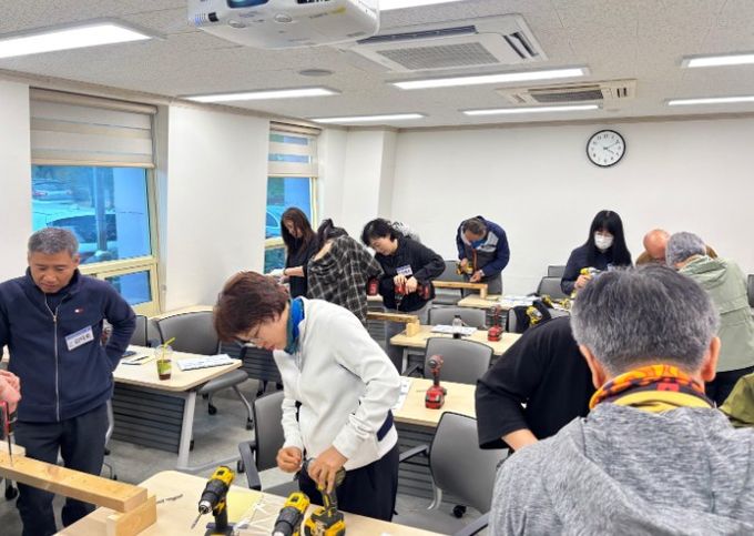 이번에 개강한 집수리아카데미 4기 과정은 주거환경 개선을 위한 간단한 수리 기술 및 홈셀프인테리어 방법을 습득하는 교육으로 ▲공구 사용법 실습 ▲방충망 ▲생활전기 이론 및 실습 ▲건축목공 이론 및 실습 ▲단열의 원리 실습 ▲도배 ▲타일 ▲수전, 샤워기 등 생활설비 그리고 2회의 찾아가는 재능기부로 구성했다.