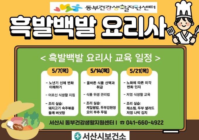 (중부시사신문) 서산시 보건소 동부건강생활지원센터에서 60세 이상 남성어르신을 대상으로 건강한 식생활 실천과 자가 건강관리 능력 향상을 위해 '흑발백발 요리사' 프로그램 대상자를 모집한다고 밝혔다.