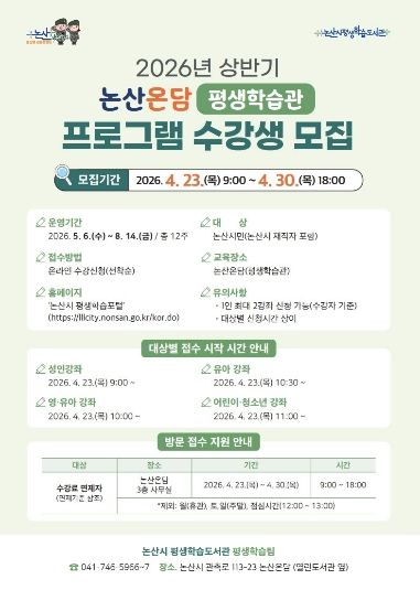 (중부시사신문) 논산시가 4월 23일부터 4월 30일까지 ‘2026년 논산시평생학습도서관 상반기 정규 프로그램’수강생을 모집한다.