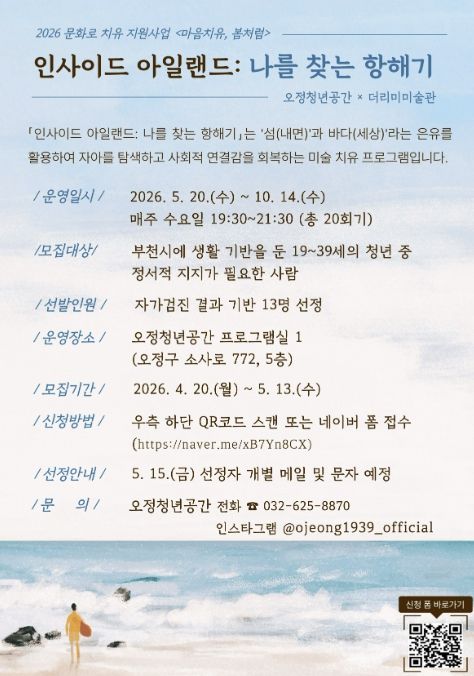 (중부시사신문) 부천시는 오정청년공간에서 정서적 고립감을 겪는 청년을 위한 미술 치유 프로그램 ‘인사이드 아일랜드: 나를 찾는 항해기’ 참여자를 5월 13일까지 모집한다.
