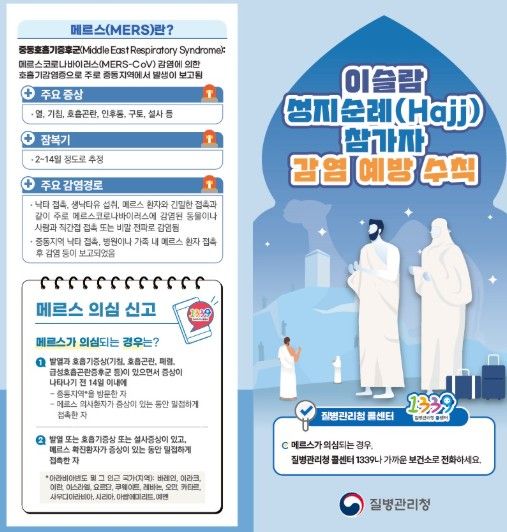 이슬람 성지순례(하지, Hajj)는 매년 수백만 명이 참여하는 대규모 행사로, 여러 국가 인파가 밀집하면서 호흡기 감염병과 수막구균 감염증 감염 위험이 높아질 수 있다. 특히 중동 지역에서는 메르스 발생이 이어지고 있어 철저한 예방이 필요하다.