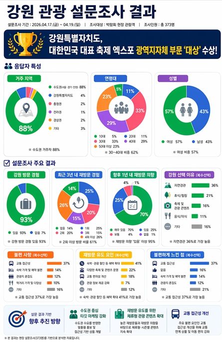 또한 관람객 대상 설문조사(총 373명)를 통해 강원 관광에 대한 인식 및 수요 특성을 분석했다.