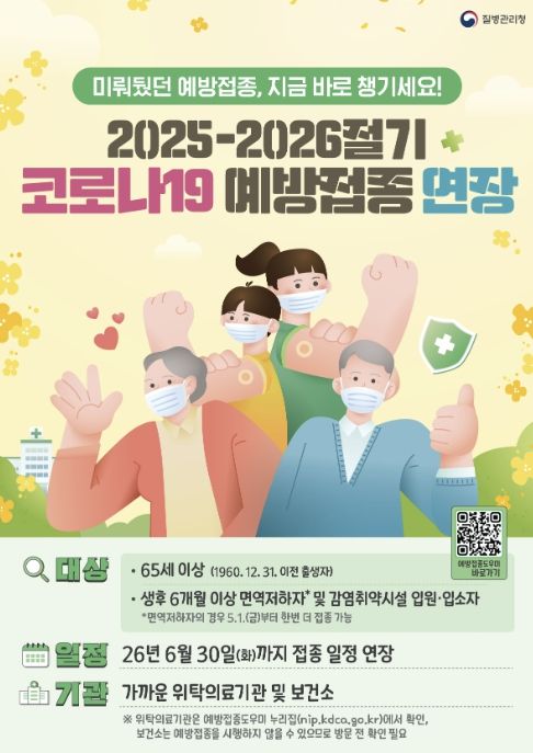 연장 기간 내 접종이 가능한 대상은 2025-2026절기 코로나19 백신을 아직 접종하지 않은 65세 이상 어르신 및 고위험군(면역저하자, 감염취약시설 입원·입소자)과 기 접종자 중 면역저하자다.