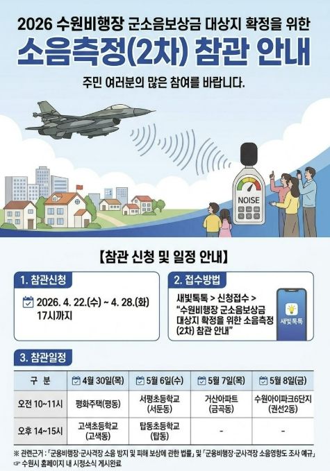 (중부시사신문) 수원특례시가 수원비행장 인근 주민들의 소음 피해 보상 근거가 될 국방부의 ‘수원비행장 소음 영향도 조사 2차 소음측정’ 주민 참관 참여자를 모집한다. 4월 28일까지 새빛톡톡으로 신청할 수 있다.