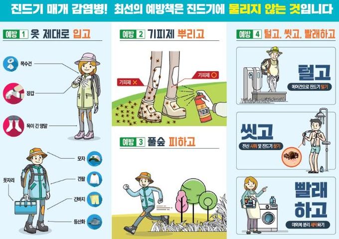 이에 시는 △야외활동 시 긴팔·긴바지·긴양말 착용하기 △진드기 기피제 사용하기 △풀밭에 옷을 벗어두거나 바로 앉지 말고, 돗자리 사용하기 △귀가 후 즉시 샤워 및 세탁 등 예방수칙 준수를 권고하고 있다.