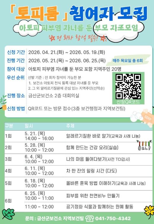 모집 대상 및 규모는 금산군 지역주민 중 아토피 피부염 자녀를 둔 부모를 포함해 총 20명이다. 단, 프로그램 특성상 전 회차 참석이 가능한 경우 우선 선발한다.