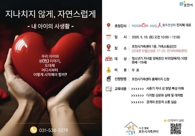 (중부시사신문) 포천시 직영 더 큰 행복 포천시가족센터는 오는 21일부터 사춘기 자녀를 둔 양육자를 대상으로 부모 교육 프로그램 ‘지나치지 않게, 자연스럽게’의 참여자를 모집한다. 이번 교육은 5월 16일 오전, 포천시가족센터 가족소통공간(반다비체육센터 1층)에서 대면 강의로 진행된다.